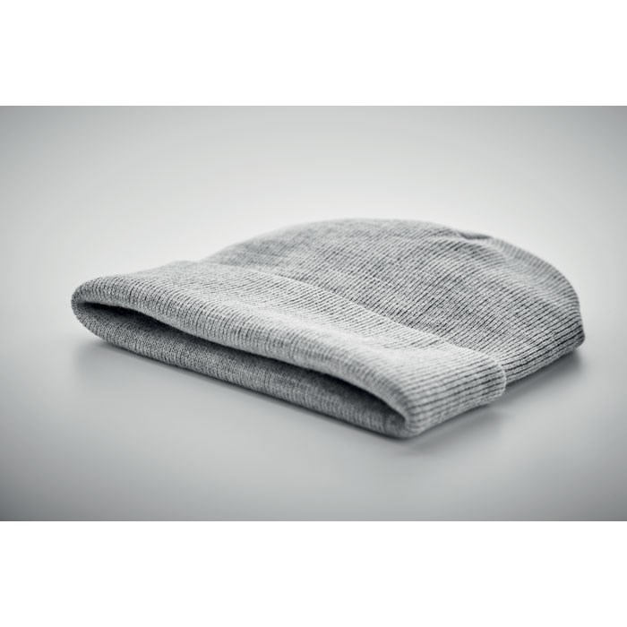Unisex knitted Beanie hat in soft stretchable RPET polyester with rolled up cuff.