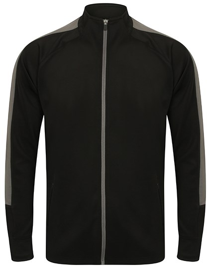 Knitted tracksuit top with contrast colour panels on outer sleeve | Contrast colour centre front zip | Zipped side pockets | Funnel neck and 1x1 ribbed cuffs | Semi-automatic lock zip sliders on all zips