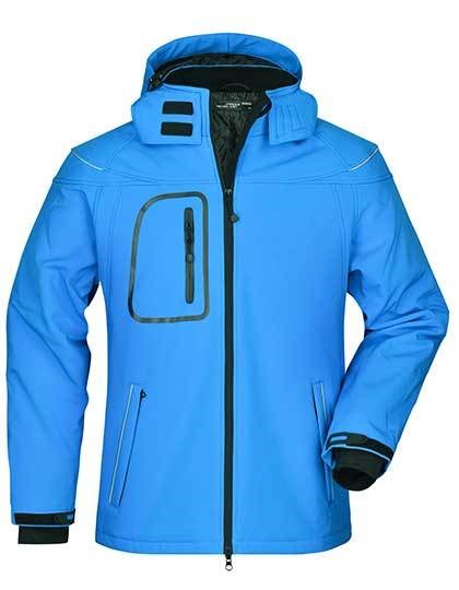 Fashionable winter softshell jacket for men | Functional 3-layer-fabric with TPU membrane | Wind- and waterproof (5000 mm water column), breathable and permeable to vapour | Seams not sealed | Detachable, padded and lined hood | Warming fleece collar | Zip under the sleeves for additional ventilation | Full-length storm flap | Reflective piping on shoulder and front pockets | 2 front pockets, 1 breast pocket, inside breast and mobile phone pocket | 2 way zip | Elastic cord with stoppers on waistband and hood | Zip for decoration at the back
