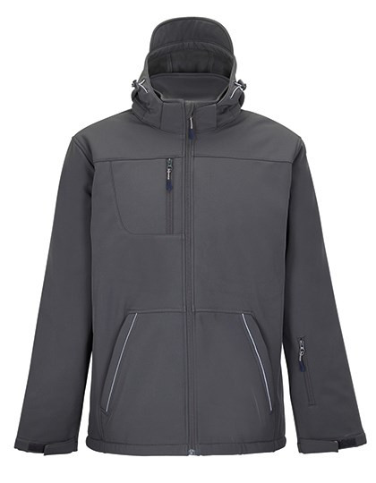 8000 mm waterproof | Breathable membrane | 100% polyester taffeta lining | Padding: 100% polyester 160 gsm | Mens fully padded winter softshell | Removable hood with eyeshade, adjustable by 2 drawstrings, stoppers and Self-gripping fastener | 3 zipped front pockets | 1 zipped sleeve pocket | 1 zipped inside pocket | 1 inside mesh pocket | Self-gripping fastener: adjustable cuffs and inner stretch cuffs | Elasticated drawstring at bottom
