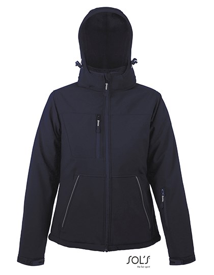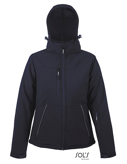 8000 mm waterproof | Breathable membrane | 100% polyester taffeta lining | Padding: 100% polyester 160 gsm | Womens fully padded winter softshell | Removable hood with eyeshade, adjustable by 2 drawstrings, stoppers and Self-gripping fastener | 3 zipped front pockets | 1 zipped sleeve pocket | 1 zipped inside pocket | 1 inside mesh pocket | Self-gripping fastener: adjustable cuffs and inner stretch cuffs | Elasticated drawstring at bottom