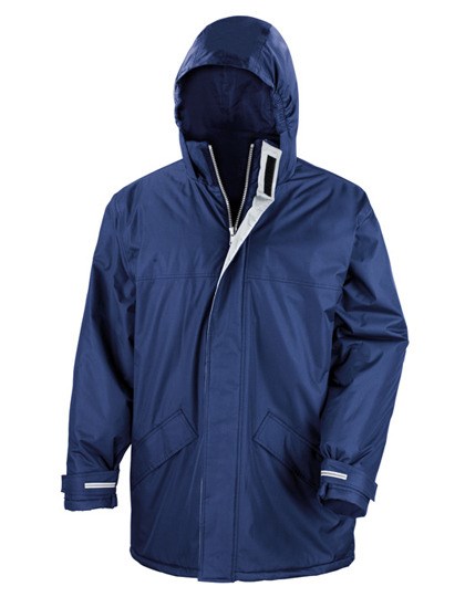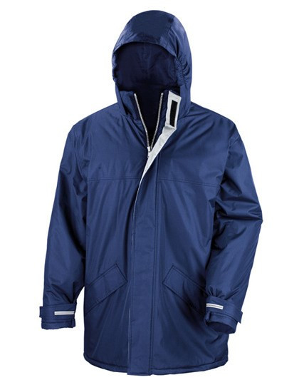 Outer: 100% Storm-Dri PU coated Polyester Pongee / Inner: 100% Polyester / Filling: 160 g/m² Polyester | Waterproof to 2000mm, windproof, super warm and quick drying | Concealed 3 panel hood in collar with adjuster | Full front zip fastening | Elasticated cuffs | Co-ordinating grey colour lining | Long fit design | 2 concealed front pockets with under storm flaps with super warm fleece lining | Fleece trim on inside of collar | Adjustable shock cords in lower hem | Fully taped waterproof seams | Decorativ access: full hem and left chest