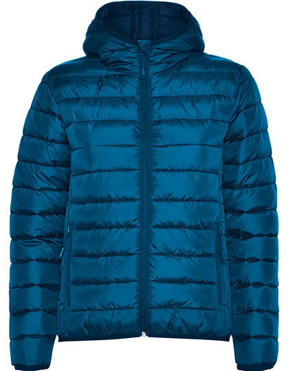 Outer material: 100% polyester, 300 taffeta; Lining: 100% polyester, 290 taffeta; Padding: 100% polyester, 150 g/m² | Quilted jacket with attached hood lined with soft, feather-light padding | Full-length, concealed zip in matching tone with chin protection | Two side pockets with zips | Elastic trim in same colour on cuffs, hem and hood | Lining in contrasting colour | Includes a bag for storing the jacket | Tailored cut | Wind- and water-repellent