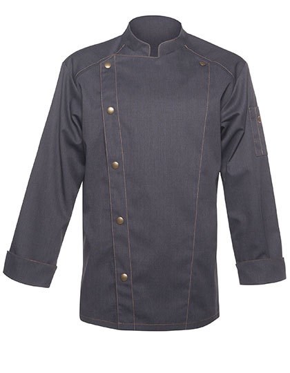 Twill weave, 195 g/m², vintage red: 175 g/m² | Highly refined, pre-shrunk, colourfast, easy-care | Chef jacket in jeans look with slim silhouette | Contrasting coloured seams | Asymmetrically closed, single-row 5-button jacket with press studs | Vented cuffs | Patched sleeve pocket on the left side with pen compartment | Suitable for industrial laundering | Washable up to 95°C