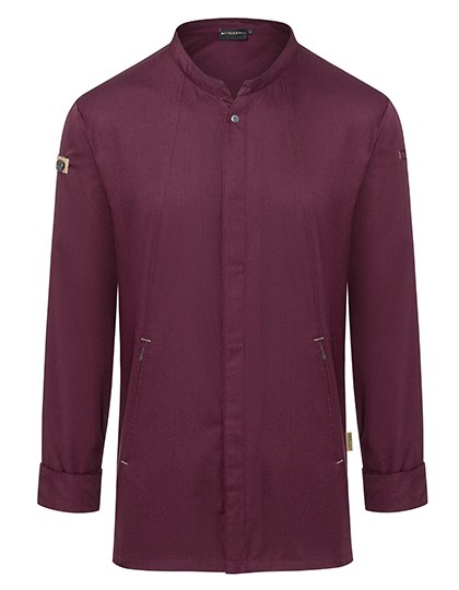 Front: twill weave, 150 g/m² | Back: jersey piqué, 170 g/m², breathable, moisture regulating | Innovative, sustainable chef jacket that combines urban style with natural flair | The product contains 72% recycled polyester and has been produced in an environmentally friendly and socially responsible manner | Slightly tailored | Back insert made of jersey piqué ensures comfortable ventilation and increased freedom of movement | Press studs for quick fastening and unfastening | Cuffs with press studs | Front part with zipped pockets and welt pocket on the left sleeve | Stylish application of contrasting ties on the sleeves and the neckline for an urban look | Green Button certified, www.g-k.eu/karlowksy