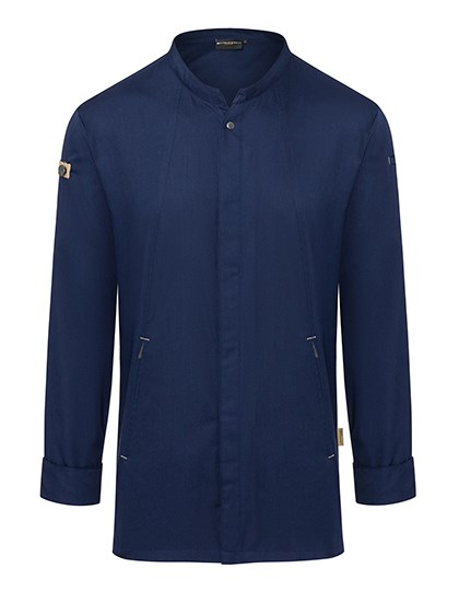 Front: twill weave, 150 g/m² | Back: jersey piqué, 170 g/m², breathable, moisture regulating | Innovative, sustainable chef jacket that combines urban style with natural flair | The product contains 72% recycled polyester and has been produced in an environmentally friendly and socially responsible manner | Slightly tailored | Back insert made of jersey piqué ensures comfortable ventilation and increased freedom of movement | Press studs for quick fastening and unfastening | Cuffs with press studs | Front part with zipped pockets and welt pocket on the left sleeve | Stylish application of contrasting ties on the sleeves and the neckline for an urban look | Green Button certified, www.g-k.eu/karlowksy