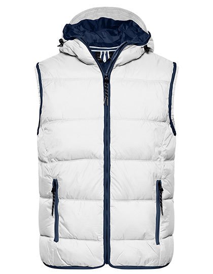 Fashionable padded vest with hood | Mat surface with light TPU-coating | Wind- and water-repellent (600 mm water column) | Two front pockets | Inside chest pocket | Full-length storm flap | Contrasting trimmings | Elastic cord with stopper on hood | Elastic armhole for perfect fit | Zip for decoration at the back