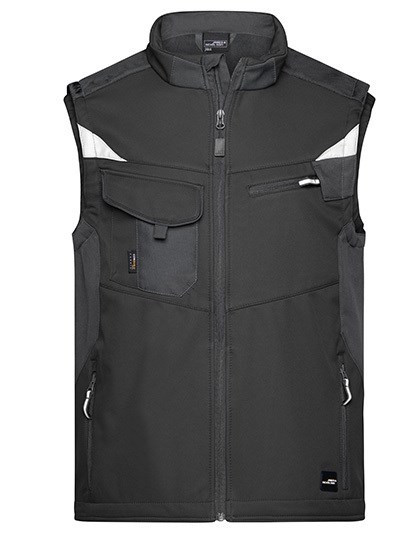 Professional softshell waistcoat with high-quality features | Robust, durable softshell material | Wind- and water-repellent (2,000 mm water column) | Breathable and permeable to vapour (2000 g/m²/24 h) | Stand-up collar, elastic cuffs | Shoulder area reinforced with CORDURA® | Full-length, covered front zip with wind guard | Side and chest pockets with zip | Breast pocket with flap, inside pockets | Reflective elements (without protective function/no PPE) on the armholes and back section
