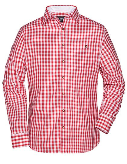 Men's shirt in traditional costume look | High-quality poplin with easy care finish, easy to iron | Roll-up sleeves with loop and button | Curved hem-line | Buttons made of imitation horn | Classic fit | Slightly fitted | Front breast pocket | Two back pleats