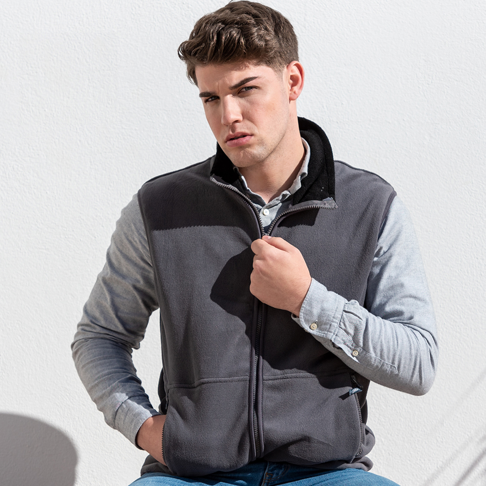 Waistcoat in warm and soft polar fleece of 280g/m2 with anti-pilling treatment. With colored inside collar, zipper closure with handle strap, side zipper pockets and elastic waist. Available in sizes M, L, XL, XXL.
