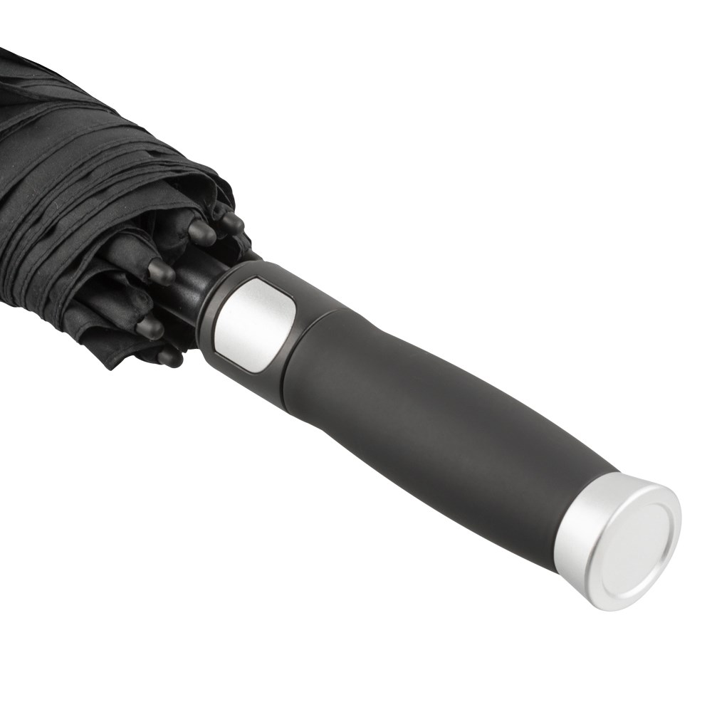 Golf Umbrella - Automatic - Windproof - AIR-VENT polyester-pongee cover (190T) (hydrophobic treatment), fiberglass ribs automatic frame in black with double frame / cover - WINDPROOF, AIR-VENT air-circulation-system, fiberglass shaft (14mm), straight 'soft-touch' coated plastic handle in black/silver with inhouse auto release button in silver colour, plastic rib tips in black, rib length approx. 75cm, diameter approx. 130 cm, length approx. 97cm, weight approx. 715g,