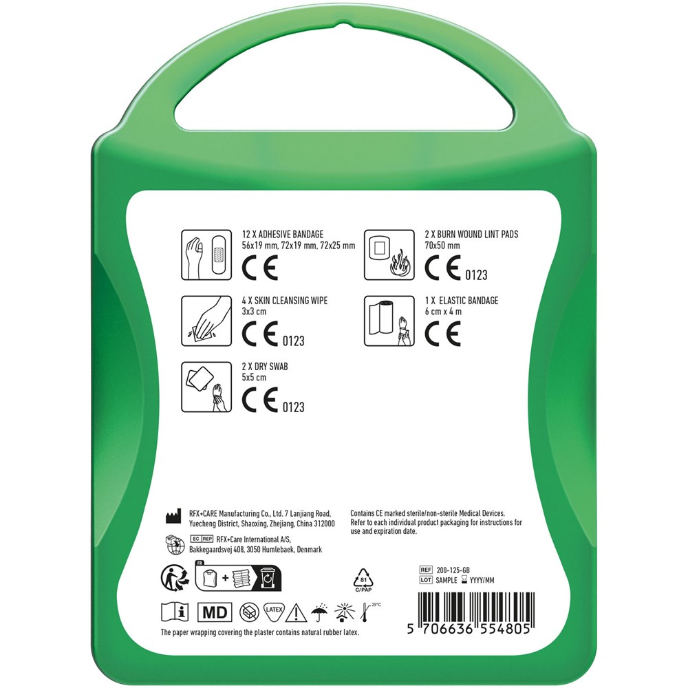 This basic first aid kit is handy to keep at home or in your car so you are prepared for injuries and emergencies. Contents: 12 wash proof plasters, 4 skin cleansing swabs, 2 dry swabs, 1 elastic bandage, 2 burn wound lint pads. All of the first aid and care products within this kit meet all applicable EU regulations. Price includes full colour print.