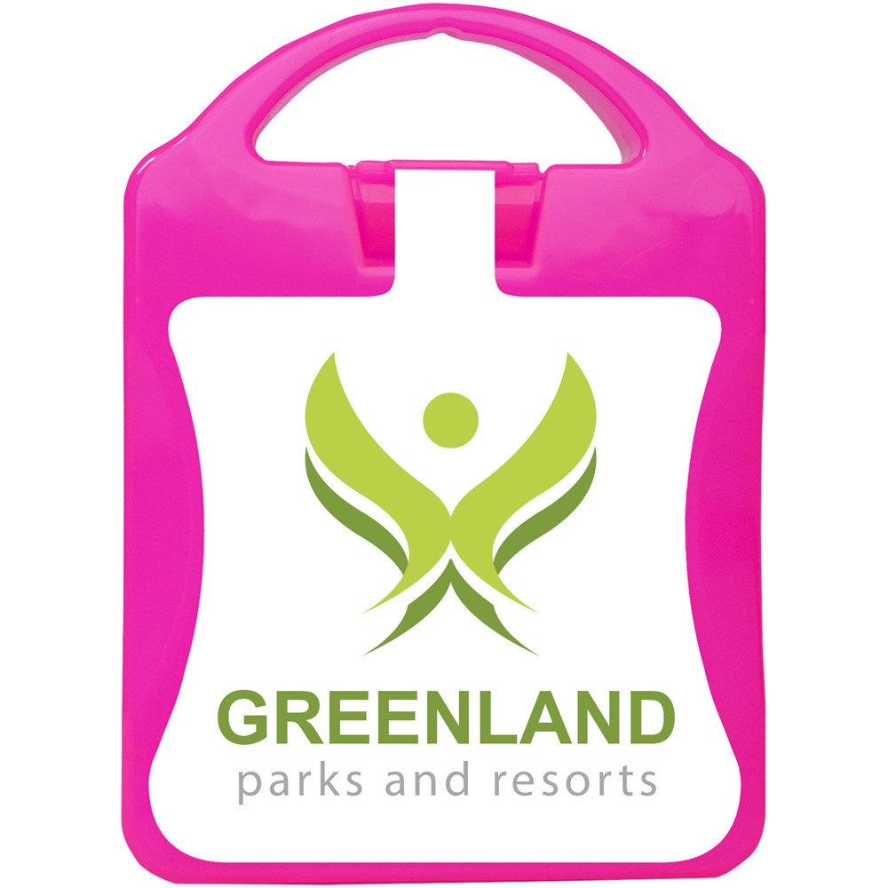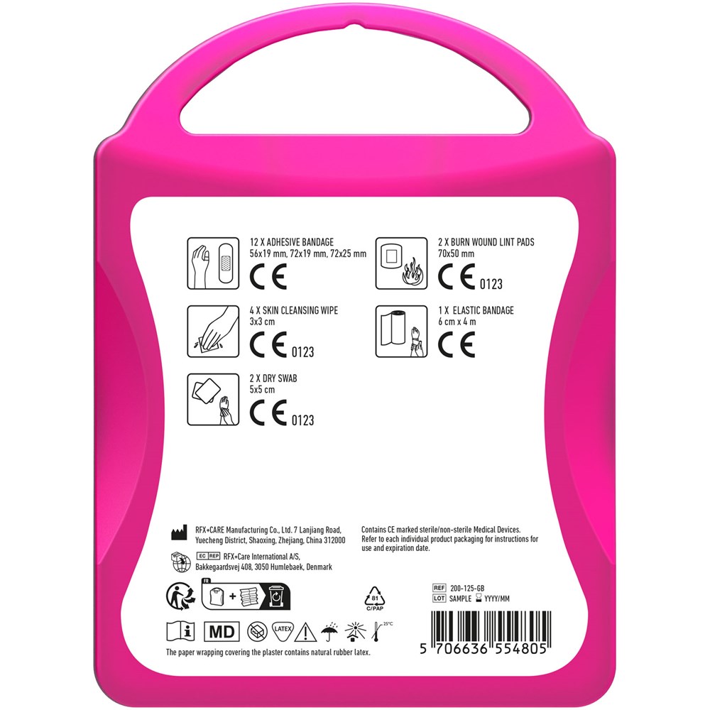 This basic first aid kit is handy to keep at home or in your car so you are prepared for injuries and emergencies. Contents: 12 wash proof plasters, 4 skin cleansing swabs, 2 dry swabs, 1 elastic bandage, 2 burn wound lint pads. All of the first aid and care products within this kit meet all applicable EU regulations. Price includes full colour print.