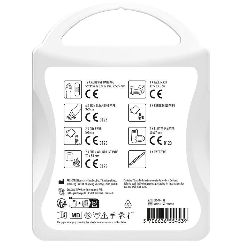An ideal first aid kit for your workplace. This kit should be kept in every workplace to be prepared for small injuries and emergencies. Contents: 12 wash proof plasters, 4 skin cleansing swabs, 2 dry swabs, 1 mask, 2 blister plaster, 2 burn wound lint pads, 2 refreshing wipes, 1 tweezer. All of the first aid and care products within the kit meet all applicable EU regulations. Price includes full colour print.