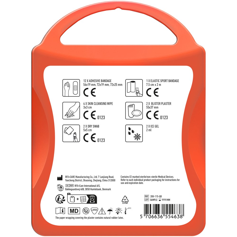 Ideal first aid kit for every active person. This kit prepares you for small injuries and accidents. Content: 12 wash proof plasters, 4 skin cleansing swabs, 2 dry swabs, 2 ice gel, 2 blister plasters, 1 elastic sport bandage. All of the first aid and care products within the kit meet all applicable EU regulations. Price includes full colour print.
