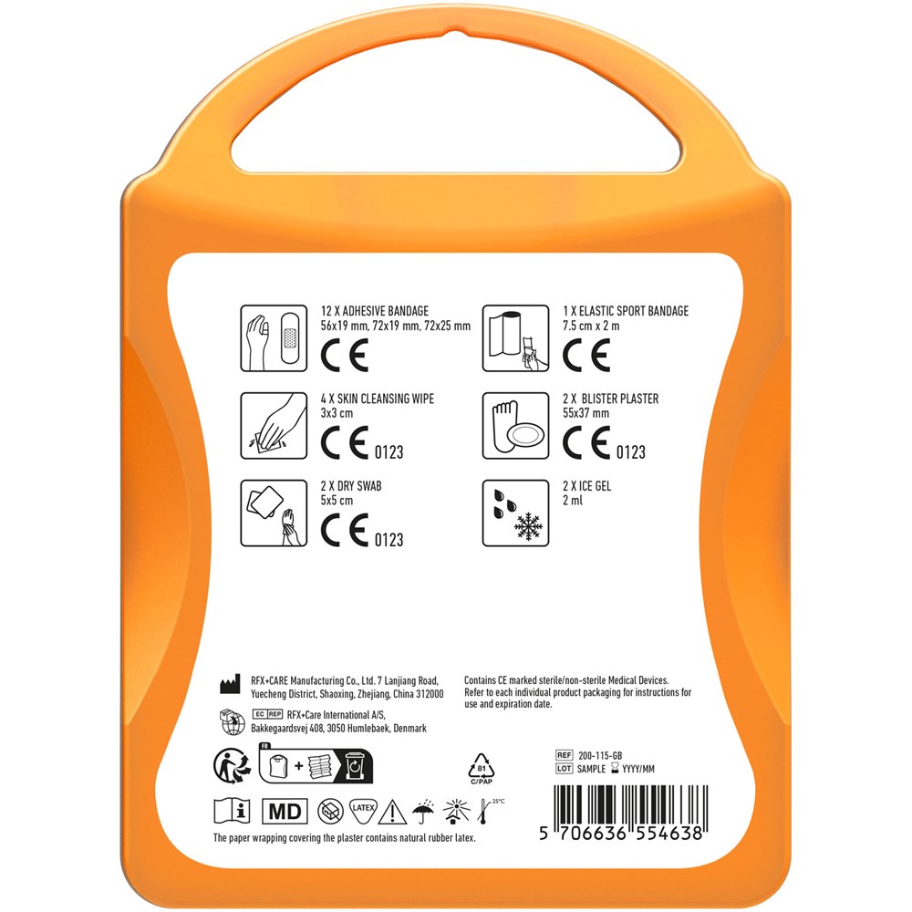 Ideal first aid kit for every active person. This kit prepares you for small injuries and accidents. Content: 12 wash proof plasters, 4 skin cleansing swabs, 2 dry swabs, 2 ice gel, 2 blister plasters, 1 elastic sport bandage. All of the first aid and care products within the kit meet all applicable EU regulations. Price includes full colour print.