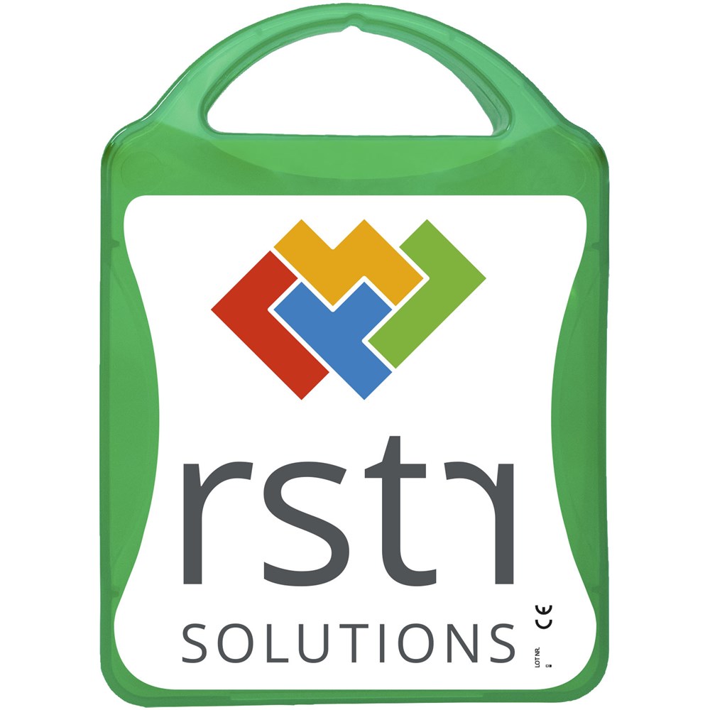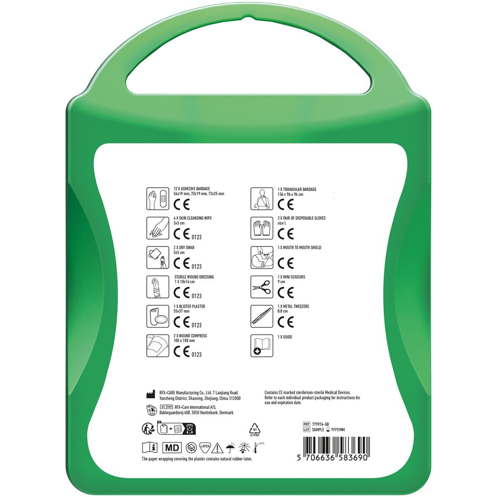 This extensive first aid kit is a handy thing to have in your house to be prepared for injuries and emergencies. Content: 1 first aid guide, 1 blister plasters, 12 wash proof plasters, 1 metal tweezer, 1 scissor, 1 triangular bandage, 1 pair of disposable gloves, 2 wound compress, 1 sterile wound dressing, 2 dry swabs, 4 skin cleansing swabs, 1 Mouth-to-Mouth shield. All of the first aid and care products within the kit meet all applicable EU regulations. Price includes full colour print.
