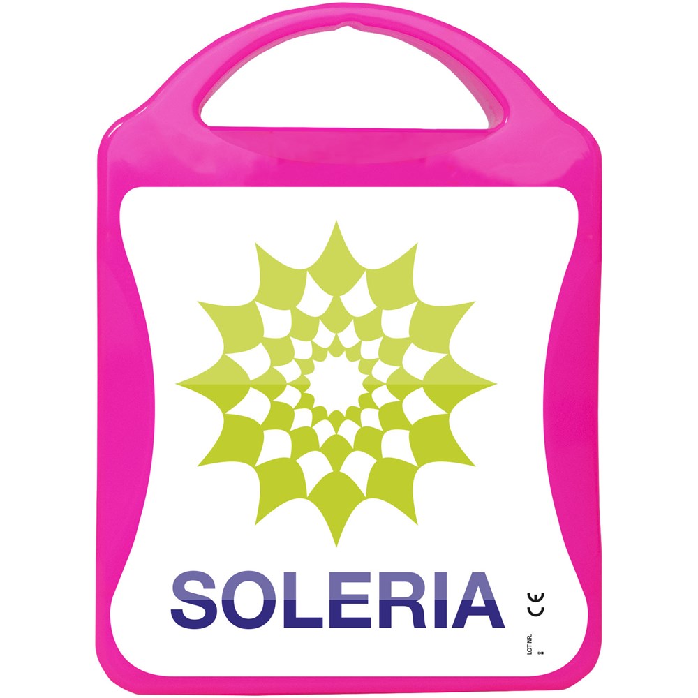 This extensive first aid kit is a handy thing to have in your house to be prepared for injuries and emergencies. Content: 1 first aid guide, 1 blister plasters, 12 wash proof plasters, 1 metal tweezer, 1 scissor, 1 triangular bandage, 1 pair of disposable gloves, 2 wound compress, 1 sterile wound dressing, 2 dry swabs, 4 skin cleansing swabs, 1 Mouth-to-Mouth shield. All of the first aid and care products within the kit meet all applicable EU regulations. Price includes full colour print.